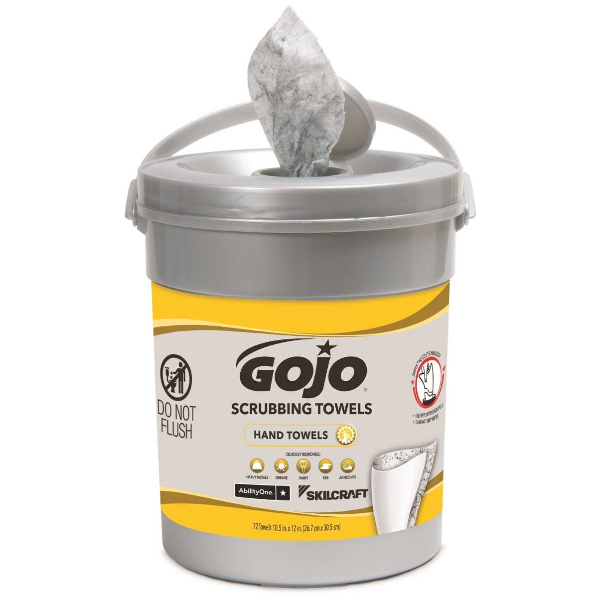 AbilityOne - 7930016997556 GOJO® SKILCRAFT® Heavy Duty - Dual Textured - Scrubbing Towels are designed to tackle tough cleaning jobs including heavy soils, tar, grease, and adhesives. Textured pre-moistened towels work quickly to scrub away dirt and soils in settings where water is not accessible. Formulated with a fresh citrus scent and skin conditioners to prevent dryness and irritation. Six canisters per box, 72 towels per canister; towels measure 19.5" x 13.25" x 8.5". Made in the U.S.A. GOJO® SKILCRAFT® Heavy Duty - Dual Textured - Scrubbing Towels are designed to tackle tough cleaning jobs including heavy soils, tar, grease, and adhesives. Textured pre-moistened towels work to scrub away dirt and soils. Made in the U.S.A.