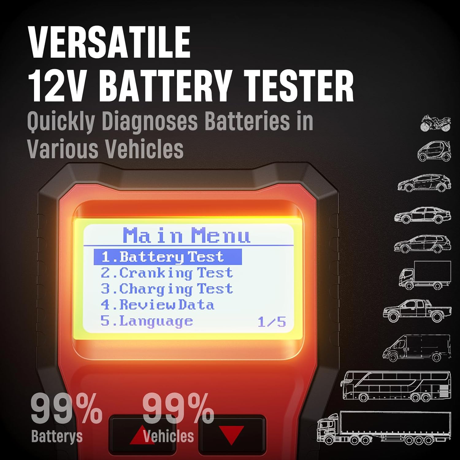 This 12V car battery tester helps you quickly and accurately check the health and performance of lead-acid batteries. It analyzes the battery’s status including voltage, cold cranking amps (CCA), internal resistance, state of health (SOH), and state of charge (SOC). Results are shown on a large backlit LCD screen for easy reading in any environment.