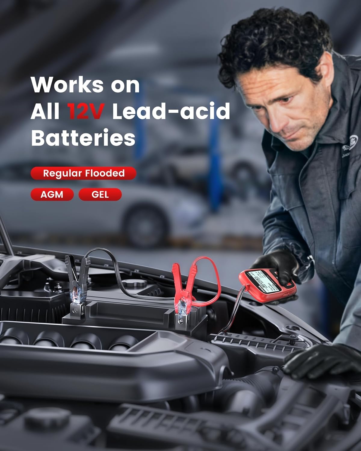 - Tests 12V lead-acid batteries including Regular Flooded, AGM Flat Plate, AGM Spiral, and GEL types.