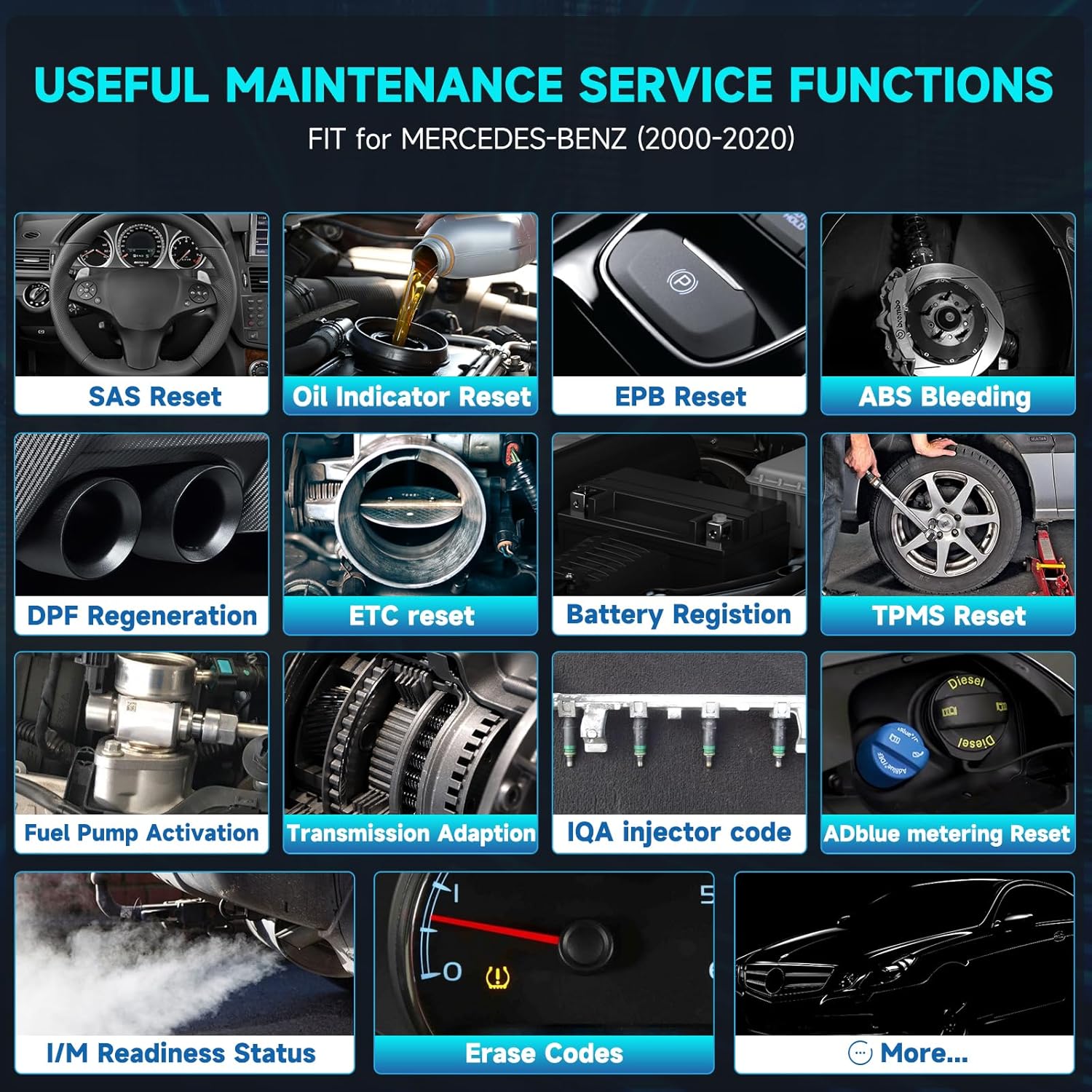 - Full system diagnostics for engine, transmission, ABS (anti-lock brakes), airbag (SRS), TPMS, SAS (steering angle sensor) and more.