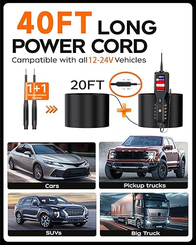 This powerful automotive power circuit probe tester is designed to help mechanics and DIY technicians quickly diagnose electrical issues in 12V and 24V vehicle systems. It functions like an advanced test light and multimeter combined, allowing you to measure voltage, current, resistance, and continuity, as well as trace shorts, check polarity, and test components such as relays, fuses, and wiring.