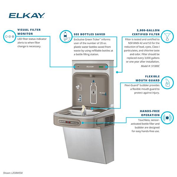 Elkay - LZO8WSSK The Elkay EZH2O® Bottle Filling Station delivers a clean quick water bottle fill and enhances sustainability by minimizing our dependency on disposable plastic bottles. Complete hands-free cooler and bottle filling station in a consolidated space saving ADA compliant design. NEW Versatile Bi-Level cooler design allows for standard cooler installation of high-left/low-right or the alternate reverse cooler installation.