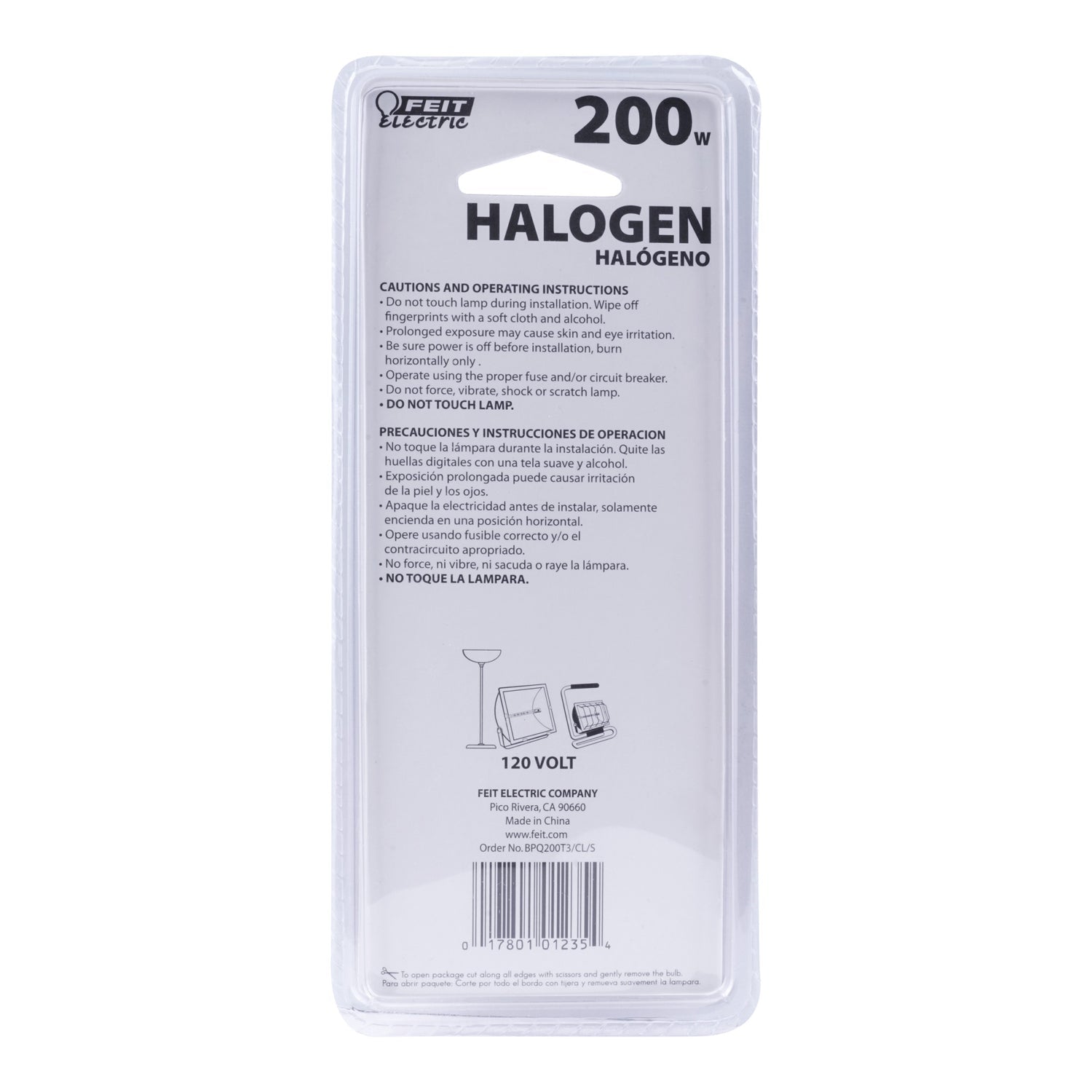 Feit Electric - BPQ200T3/CL/S The 200 Watt Clear Halogen Light Bulb is designed for your home's outdoor lighting applications. This tubular halogen bulb uses 200-watts of energy and lasts for up to 2,000 hours. The bulb emits a bright, white light. Use the bulb with only 120 volt fixtures. It has a T3 tubular shape with a RSC base.