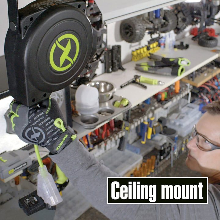 Flexzilla® Retractable Extension Cord Reels come pre-loaded with 25 or 50 feet of oil-resistant cord, a lighted triple tap outlet and grounded 5 foot lead-in cord. Each reel also contains a circuit breaker with reset button, adjustable cord stopper, power indicator light, and a swivel mounting bracket. The reels lock the cord out in 1 foot increments. The impact resistant housing protects and stores the extension cord when not in use. These retractable reels are ideal for general, commercial and industrial use.