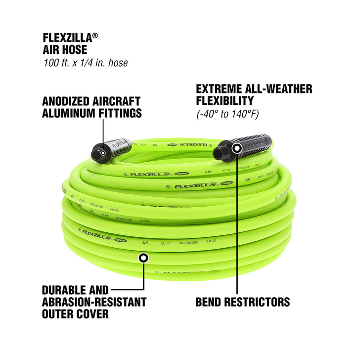 Flexzilla® Air Hose is a revolutionary hose featuring a Flexible Hybrid Polymer material that redefines flexibility. This engineered polymer-blend material permits use in environments where general purpose PVC and rubber hose may become too stiff. Flexzilla hose characteristics offer zero memory allowing it to lay flat. It won’t work against you during operation and coils easily after use. Flexzilla offers extreme all-weather flexibility, even in subzero conditions, and is ideal in both hot and cold environments where tight radius bends are needed.