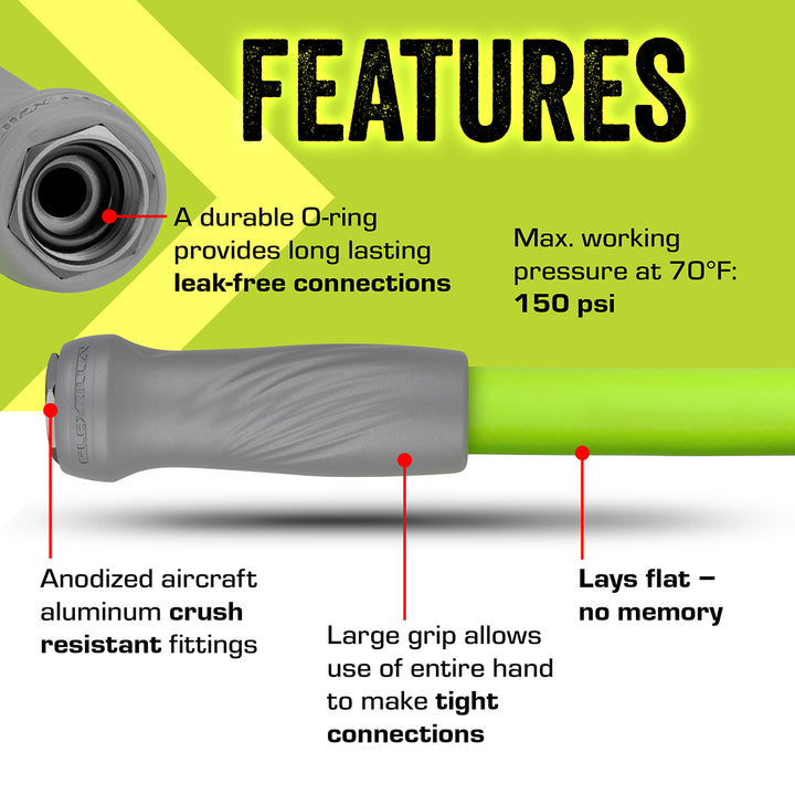 Features- MALE & FEMALE SWIVELGRIP CONNECTIONS - Hose and grip rotate independently, makes connections and uncoiling easy, and naturally releases coils