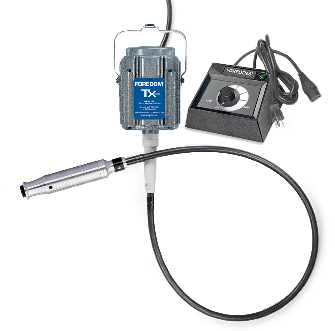 Foredom’s most powerful flex shaft machines with 1/3HP have permanent magnet DC motors that feature the latest in flex shaft technology. These ball bearing models utilize advanced rare earth magnets (in place of the wound fields in our universal type Series SR motors) that deliver more torque at the low end and throughout the entire speed range of 500 to 15,000 RPM. No other flex shaft gives you greater control of the cutting tool, drill, or bur under any load. Comes equipped with a motor bale for hanging, and our standard 39″ long key tip inner shaft and outer sheath for connecting to any of Foredom’s key tip compatible handpieces.