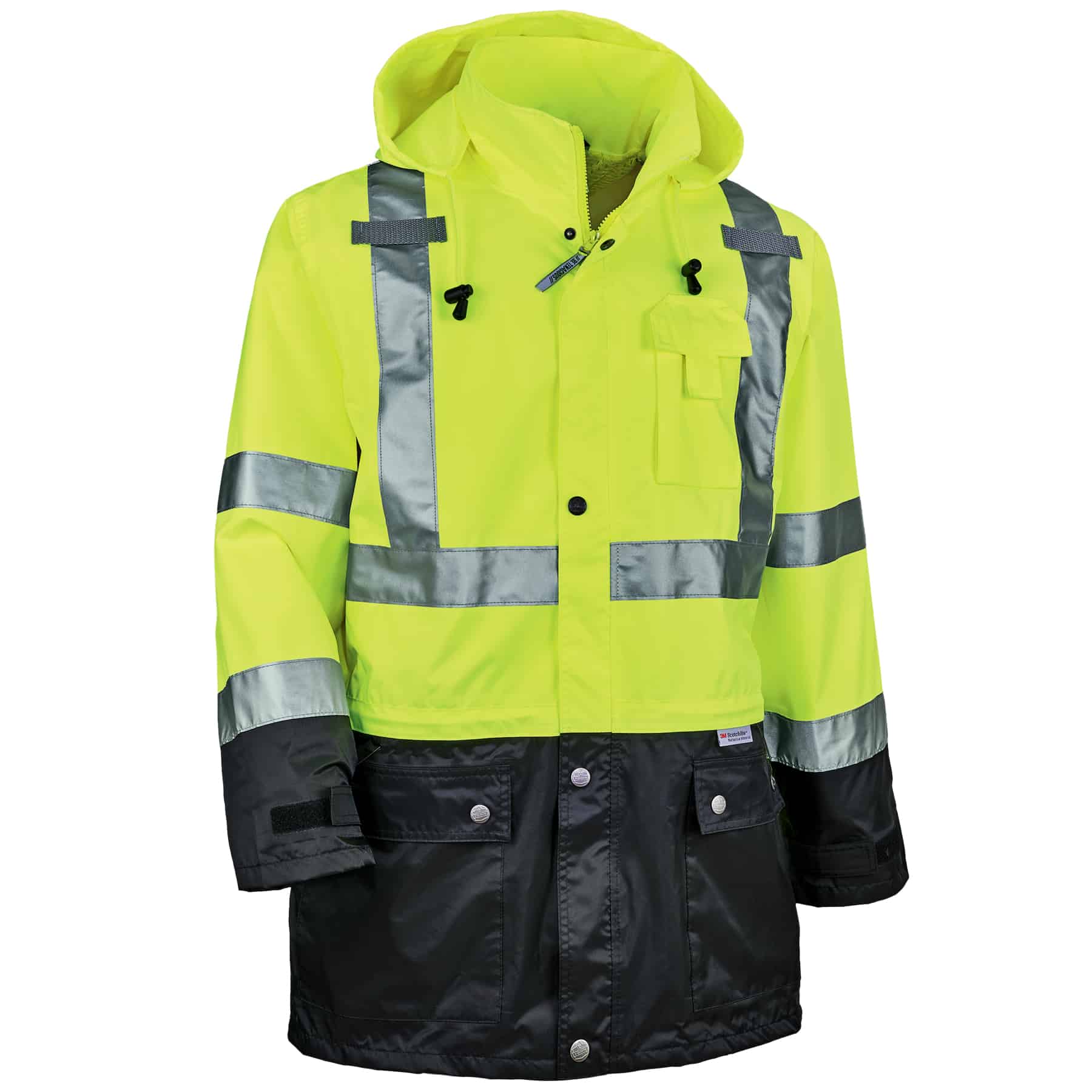 This waterproof work jacket offers comfortable protection against the elements for those working in road construction, utilities, construction, emergency response, airline, railway or survey crews.