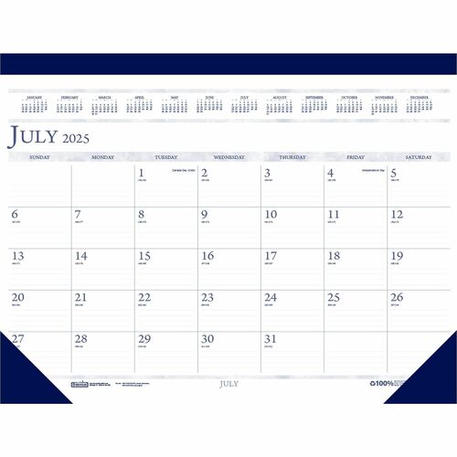House of Doolittle - HOD155 Academic desk pad calendar offers a one-page-per-month format and ranges 14 months from July to August. Each sheet is perforated at the top for easy removal. Each spread includes ruled daily blocks (3" x 2-1/8"), Sunday-through-Saturday scheduling, count of days/days remaining, holidays and a 12-month reference across the top. Planning pages are bound at the top and printed in deep blue and gray in soy ink on FSC certified recycled paper. Nonrefillable desk pad calendar offers blue, simulated leather binding at the top and two vinyl corners at the bottom to hold pages in place.