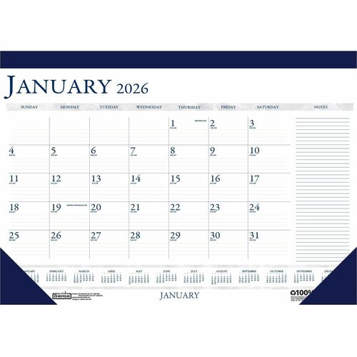House of Doolittle - HOD164 Calendar desk pad offers monthly planning and protection for your desktop with planning pages bound and perforated at the top. Two reinforced, blue leatherette corners secure pages at the bottom. Planning pages range 12 months from January to December and are printed in deep blue and gray. One-page-per-month format includes ruled daily blocks (2-3/8" x 1-7/8"), count of days/days remaining, Sunday-through-Saturday scheduling, ruled notes area, and a full-year calendar reference along the bottom. Nonrefillable desk pad contains paper made with a high percentage of recycled material.