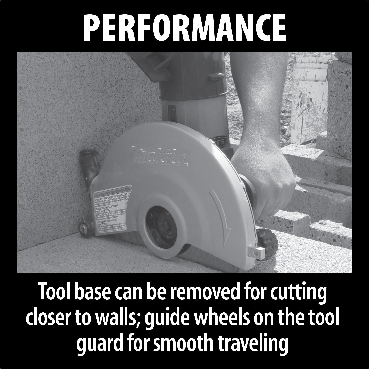- Guide wheels on the tool guard ensure smooth traveling of tool over surface material when base is removed for cutting closer to walls