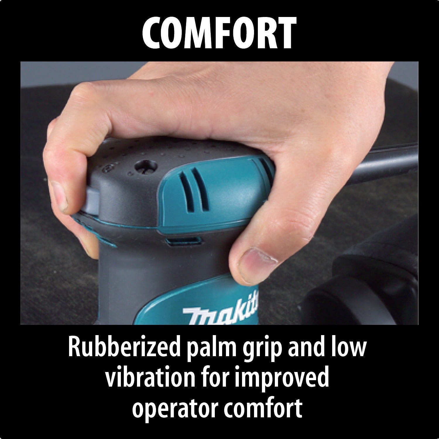Makita - BO5030 Makitas 5-Inch Random Orbit Sander (model BO5030) delivers fast, smooth performance with better grip and control. The BO5030 is ideal for woodworkers and finish carpenters who require a best-in-class random orbit sander. It features a pad control system for controlled pad speed upon start up, with a powerful 3 AMP motor for continuous operation, 1/8-inch random orbit action, and 12,000 OPM for fast and smooth sanding. The BO5030 is precision engineered with all ball bearing construction for longer tool life.