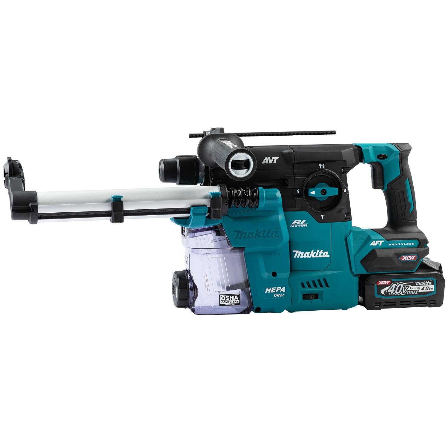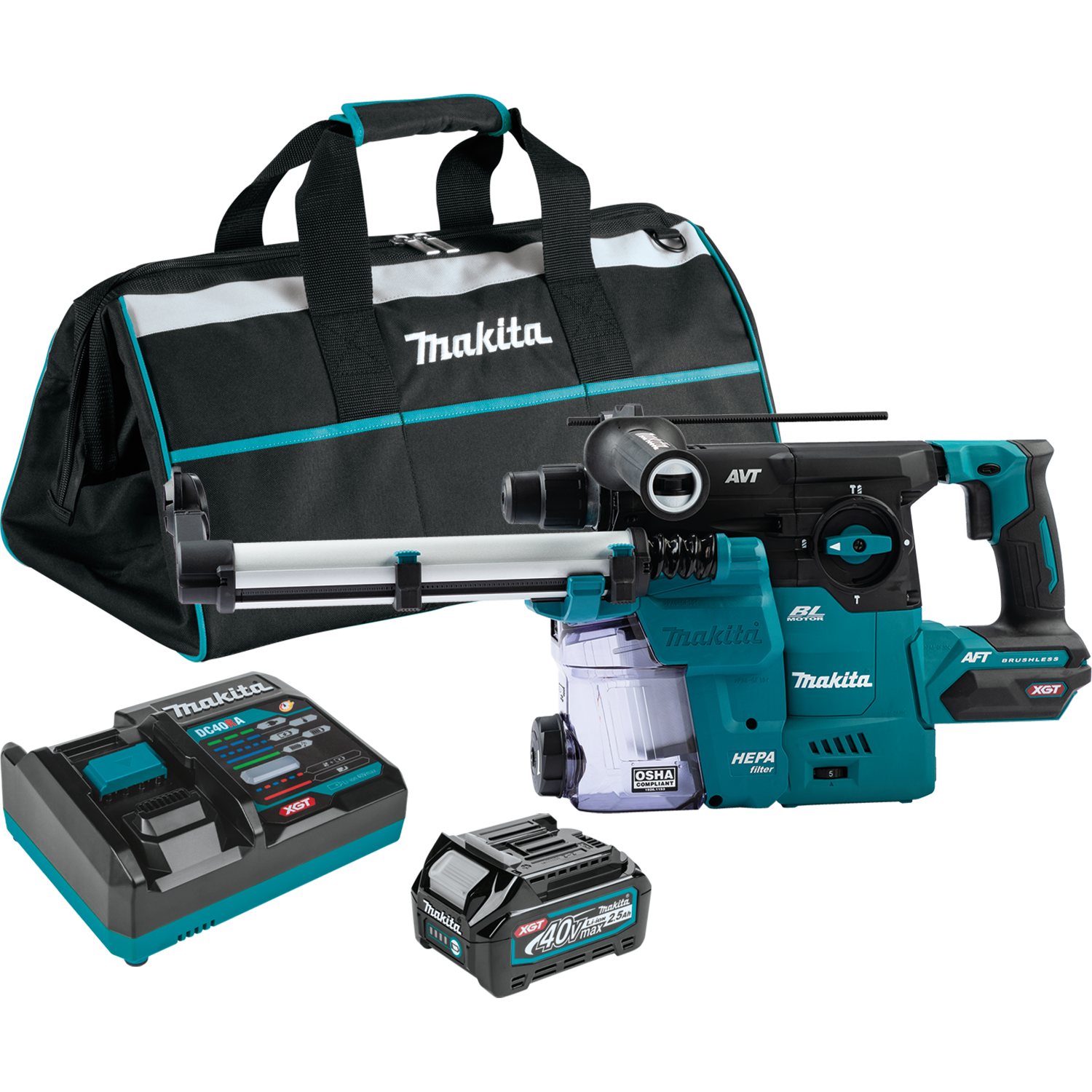 Makita - GRH08M1W The 40V max XGT® Brushless Cordless 1-3/16" AVT® Rotary Hammer Kit w/ Dust Extractor accepts SDS-PLUS bits, AFT®, AWS® Capable (model GRH08M1W) is a cordless concrete solution designed for heavy-load applications. It delivers the power, speed, and run-time for corded demands, without the cord.The GRH08M1W is powered by a 40V max battery with a Makita-built brushless motor that combines to deliver the power and performance required for heavy-load applications. It can deliver up to 135 of 3/8" holes using a fully charged 40V XGT® 4.0Ah battery*. The variable speed dial and trigger enable the user to match the speed to the application. This hard-hitting performance is combined with advanced comfort and convenience features including Active Feedback-Sensing Technology (AFT®), which electronically turns off the motor if the bit rotation is suddenly forced to stop. It is also equipped with Anti-Vibration Technology (AVT®) for reduced vibration. More than just a padded handle, AVT is an internal counterbalance that uses air pressure to move counterweight pistons in the opposite direction of the drive piston to actively reduce vibration. In addition, the vibration-absorbing back handle and side handle are engineered to further reduce vibration. For added durability in harsh job site conditions, Extreme Protection Technology (XPT,) is engineered for improved dust and water resistance.The GRH08M1W has dust extraction capability and is OSHA Table 1 compliant with an on-board HEPA Dust Extractor or stand-alone AWS® Extractor options. For added efficiency, the Rotary Hammer is equipped with Auto-Start Wireless System (AWS®), which uses Bluetooth® technology for wireless power-on and power-off communication between the equipped tool and dust extractor (sold separately). Once connected via AWS, the AWS-equipped dust extractor will automatically power on or off when the AWS-equipped cordless tool starts or stops, running only when the tool is in use. This increases productivity on a single charge and reduces continuous noise at the job or work site.Constant speed control automatically applies additional power under load for optimum performance. The torque limiting clutch is engineered to prevent gear damage by automatically disengaging the gears if the bit binds, and constant speed control automatically adds power to the motor to maintain speed under load to complete the most demanding jobs.Additional performance features include an electric brake, a built-in L.E.D. light, and an ergonomic soft-grip handle with a large 2-finger trigger that provides increased comfort on the job. It also features a retractable hook that allows the tool to be secured when not in use. It has 3-modes of operation "Rotation Only", "Hammering with Rotation" or "Hammering Only" for multiple applications. The GRH08M1W is ideal for a range of trades including mechanical/electrical/plumbing contractors, concrete contractors, road and bridge contractors, utility workers, pest control, maintenance operations, and more. It accepts SDS-PLUS bits.XGT is a system of equipment, tools, batteries, and chargers utilizing 40v max lithium-ion batteries. XGT is engineered to deliver high power to take on high-demand applications, allowing users to completely transition to a cordless job site. XGT is equipped with advanced brushless motor engineering, intelligent digital communication, and superior durability features to outpower, outsmart, and outlast the rest.*Tested 2-3/8" deep holes in 5,000 PSI concrete