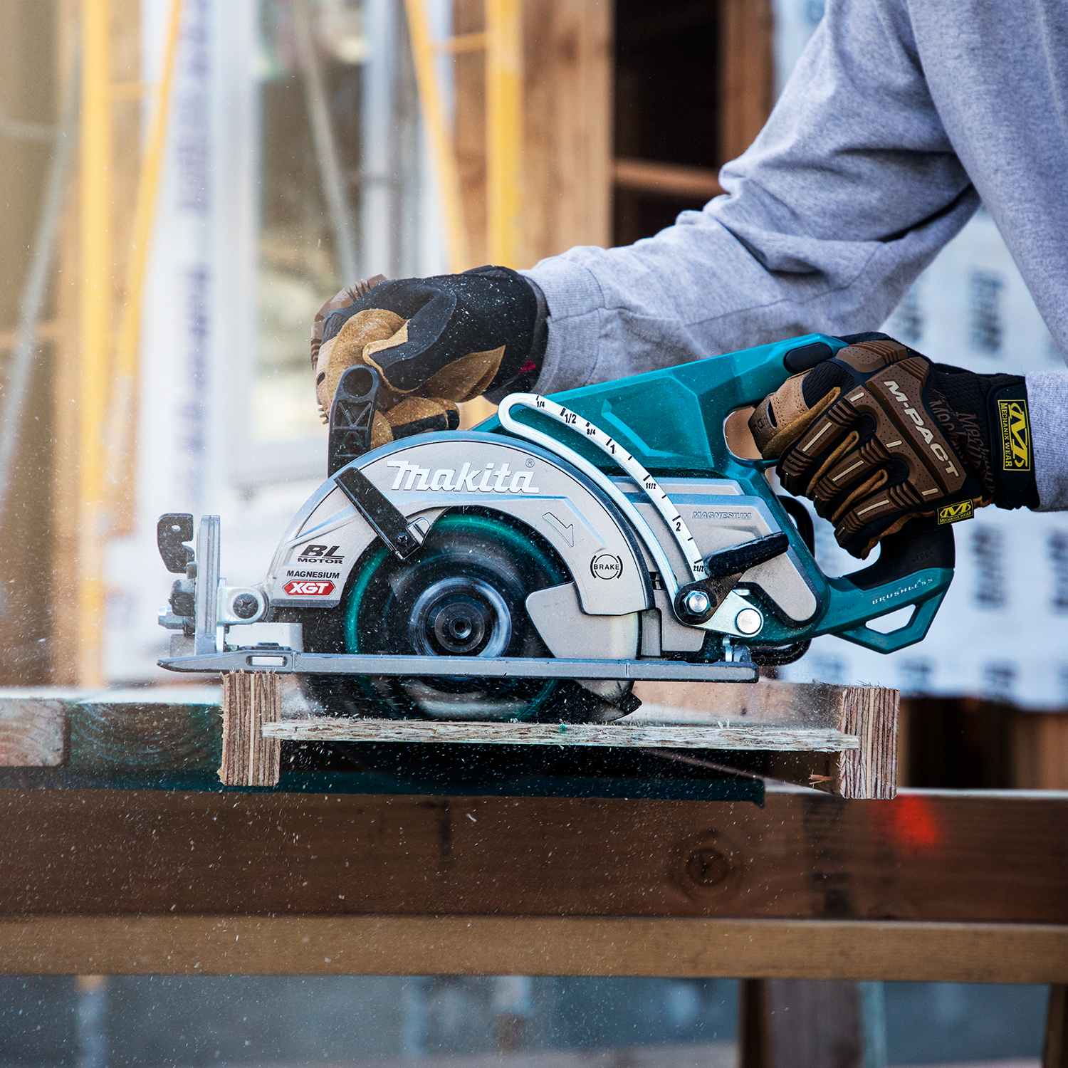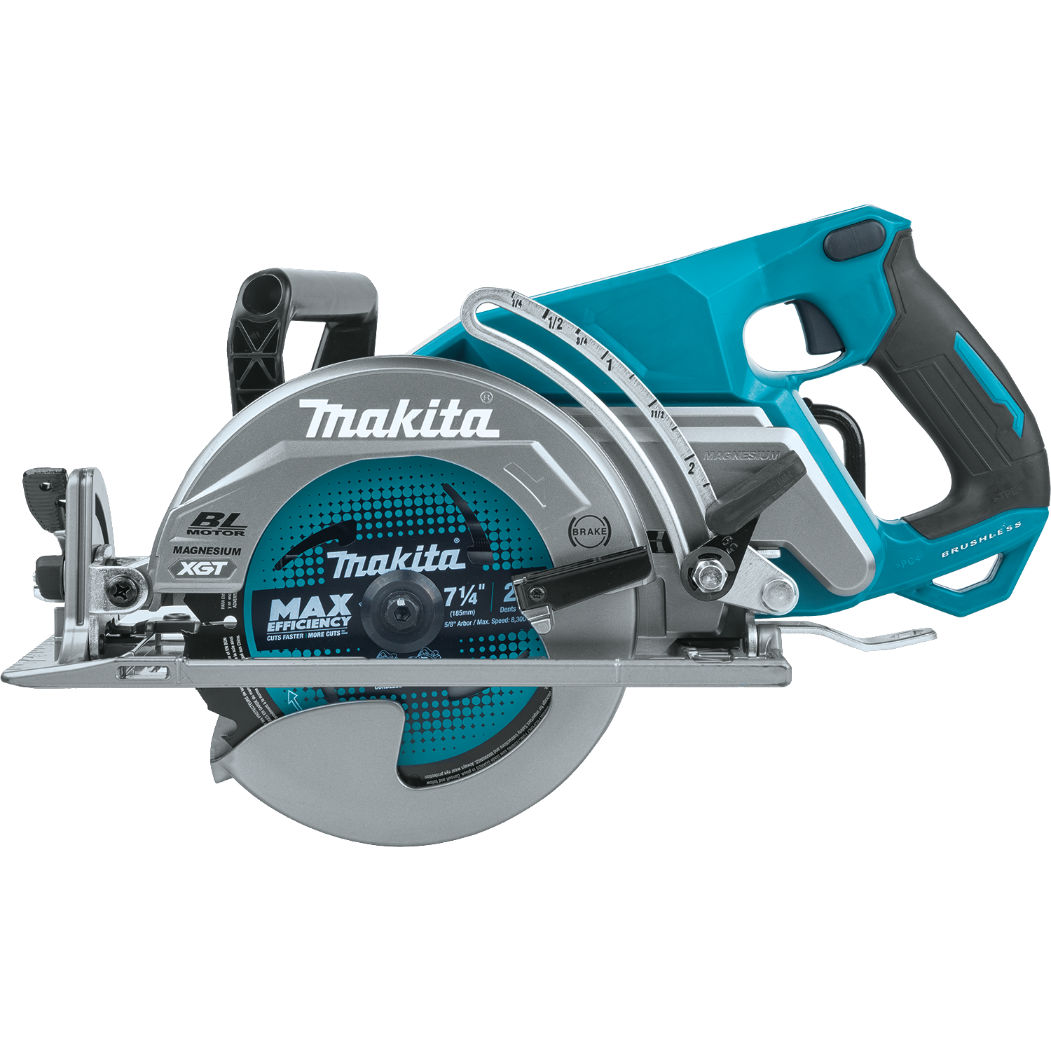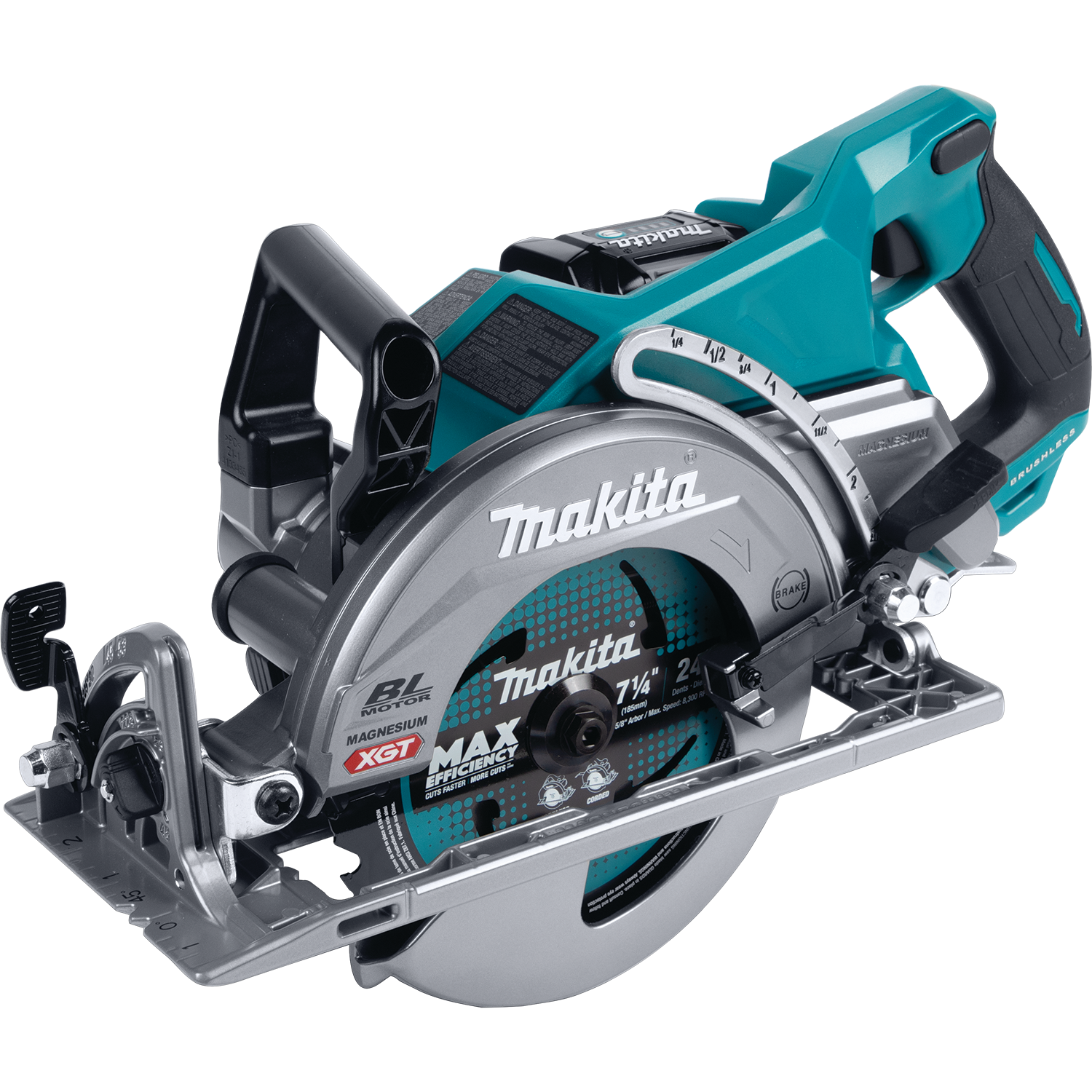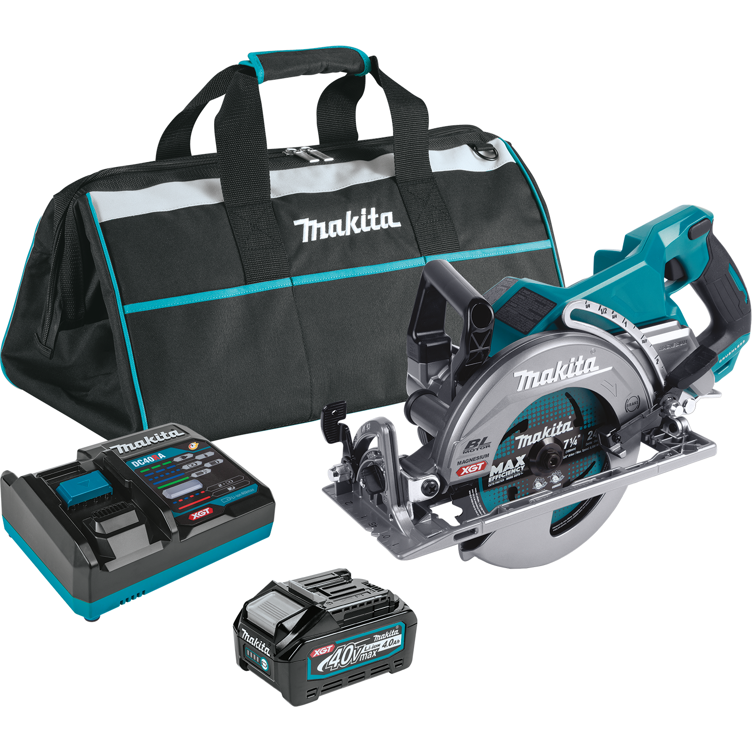 Makita - GSR01M1 The 40V max XGT® Brushless Rear Handle 7-1/4 Circular Saw Kit (GSR01M1) provides cordless convenience, while taking on high-demand applications. The Makita-built brushless motor delivers 6,400 RPM for high-speed cutting performance. It cuts 3X the material in a single pass with a large cutting capacity of 2-9/16. This saw is ideal for framers, builders, roofers, forming, and more. The GSR01M1 offers 56-degrees bevel capacity with positive stops at 22.5-degrees and 45-degrees and a bevel up to 56-degrees. The saw features an electric brake for maximum productivity and a die-cast magnesium base.Automatic Torque Drive Technology adjusts cutting speed under load for optimum cutting performance. The saw is also equipped with Makita's Extreme Protection Technology (XPT,), is a series of integrated seals designed to improve a tool™s operation in harsh conditions by channeling water and dust from key internal components.XGT is a system of equipment, tools, batteries, and chargers utilizing 40v max lithium-ion batteries. XGT is engineered to deliver high power to take on high-demand applications, allowing users to completely transition to a cordless job site. XGT is equipped with advanced brushless motor engineering, intelligent digital communication, and superior durability features to outpower, outsmart and outlast the rest.