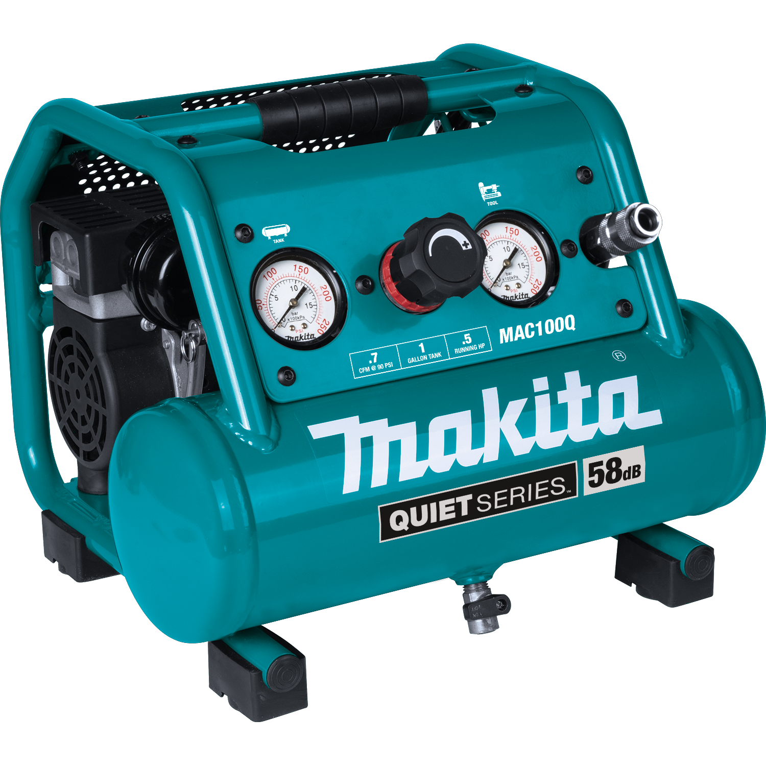 The Makita® ½ HP 1 Gallon Compact, Oil-Free, Electric Air Compressor (MAC100Q) features a Quiet Series Design, combining strong performance with lower noise. At only 58 dBA, it™s ideal for indoor use during case and base installation, trim and finish carpentry, cabinet or furniture making, and more. The MAC100Q runs at a lower RPM, resulting in longer motor and pump life. It is powered by an efficient 1/2 horsepower induction motor that provides up to 135 PSI. It also features a lightweight design (only 25.5) for increased portability.