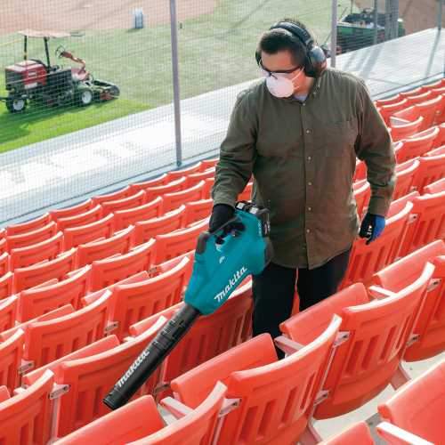 Makita - XBU02PT1 Landscapers and contractors are demanding more cordless alternatives to gas-powered outdoor power equipment. Makita is meeting demand with an expanding line of cordless OPE that includes the 36V (18V X2) LXT® Brushless Blower. With zero emissions and lower noise, the 18V X2 (36V) Cordless Blower is a welcome solution for clean-up applications. It™s powered by two 18V LXT® batteries for maximum power and run time, but without leaving the 18V battery platform. With the efficient Makita BL, brushless motor, the blower delivers longer run time, increased power and speed, and longer tool life. Model XBU02PT1 is a kit and includes the Blower, four fast-charging 18V LXT® Lithium-Ion 5.0Ah batteries and an efficient 18V Dual Port Rapid Optimum Charger. Makita™s efficient BL, Brushless motor is electronically controlled to optimize battery energy use for up to 50% longer run time per battery charge than similar non-brushless tools. Electronic controls efficiently use battery energy to match the changing demands of the application for increased power and speed when needed. With no carbon brushes, the Makita BL, Brushless motor runs cooler and more efficiently for longer life. When powered by two 18V 5.0Ah batteries, the efficient brushless motor delivers up to 28 minutes of run-time on dial setting #3 on a single charge. The Blower features Makita Extreme Protection Technology (XPT,). XPT, is a protective seal inside the tool, and is engineered for improved operation in harsh conditions by channeling water and dust from key internal components. It™s part of Makita™s expanding 18V Lithium-Ion system, the world™s largest cordless tool system powered by 18V Lithium-Ion slide-style batteries. Makita 18V Lithium-Ion batteries have the fastest charge times in their categories, so they spend more time working and less time sitting on the charger. For improved tool performance and extended battery life, Makita created Star Protection Computer Controls,. Star Protection is communication technology that allows the Star Protection-equipped tool and battery to exchange data in real time and monitor conditions during use to protect against overloading, over-discharging and overheating. For increased versatility, the tool can also be powered by Makita 18V LXT® and Compact Lithium-Ion batteries with the star symbol on the battery indicating Star Protection inside.