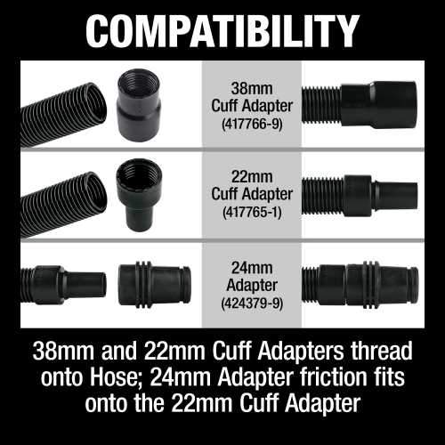 - Equipped with anti-static hose (1" x 11™) and three adapter cuffs (22, 24 and 38 mm) for versatility of applications