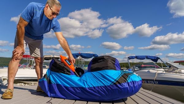 Ideal for boaters, campers, vacationers, schools, and recreational use, this unit plugs into a standard 110 V/120 V outlet and includes tapered adapters for multiple valve sizes. Its lightweight and portable design makes storage and transport easy.