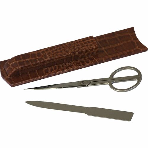 Protacini - DACA6119 Library Set features a stunning combination of Italian leather and handcrafted design to make it a showpiece that you'll be proud to feature prominently on your desk. Silver-accented scissors and letter opener are neatly stowed in a gorgeous leather holder unit that adds both function and beauty. Solid and hefty, the quality of the materials and construction are readily apparent. Unique, high-end style makes a statement of luxury in your office from day one. Leather adds a smart, sophisticated look to your space. Letter opener has a 5" blade. Scissors have 4" blades. Soft velveteen protects surfaces from scuffs and scratches.