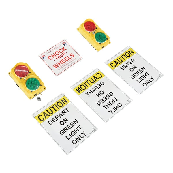 IncludesEconomy, model DTS-5, comes with two (2) yellow polypropylene traffic lights, 6."W x 11."H, each having a green and a red lens. The light containing a push button is placed inside the dock area for the dock attendant, and the other is placed outside for the truck driver.