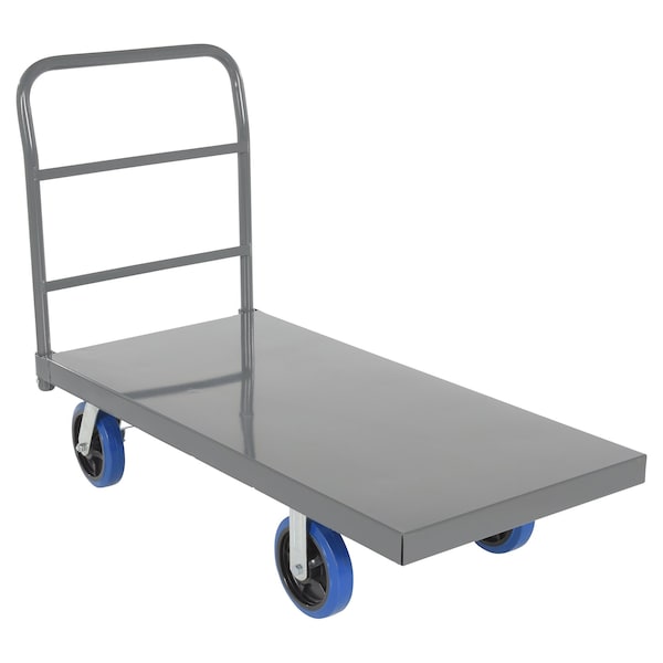 This steel platform truck with a solid, smooth steel deck is all welded and features structural reinforcement underneath for extra strength. Includes one (1) removable high-polished steel handle and rolls smoothly casters. Comes standard with a floor lock.