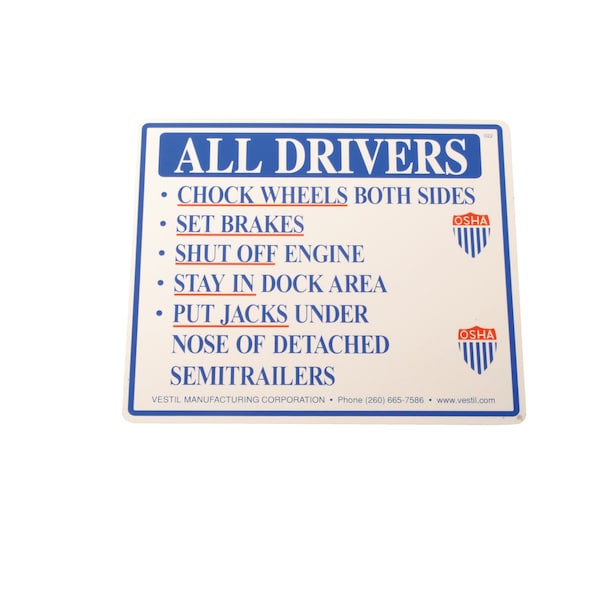 FeaturesHighly visible sign warns trucks and dock workers to chock wheels. Bright red lettering provides high visibility for drivers. Weather resistant sign never wears off. Reflective sign works with docks open at dawn and dusk