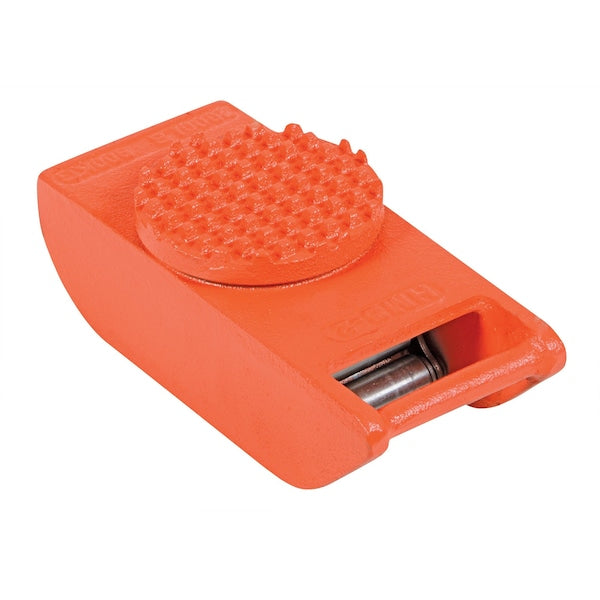 Made of high-strength annealed ductile iron, this steel machine roller has swivel tops that rotate three hundred sixty degrees (360 degrees) on chrome steel ball bearings to allow for easier turning. The rollers form a "tank track" to revolve around a center load bearing plate in the frame to provide maximum maneuverability. The weight of the load is transferred directly from the load bearing plate to the rollers, eliminating axle friction and requiring less power to start and move. A spring loaded locking mechanism on the swivel tops can be engaged in detents at forty-five degrees (45 degrees) intervals. This unit is virtually maintenance free. Steering bars split in two (2) and connect with sleeve for easy storage.