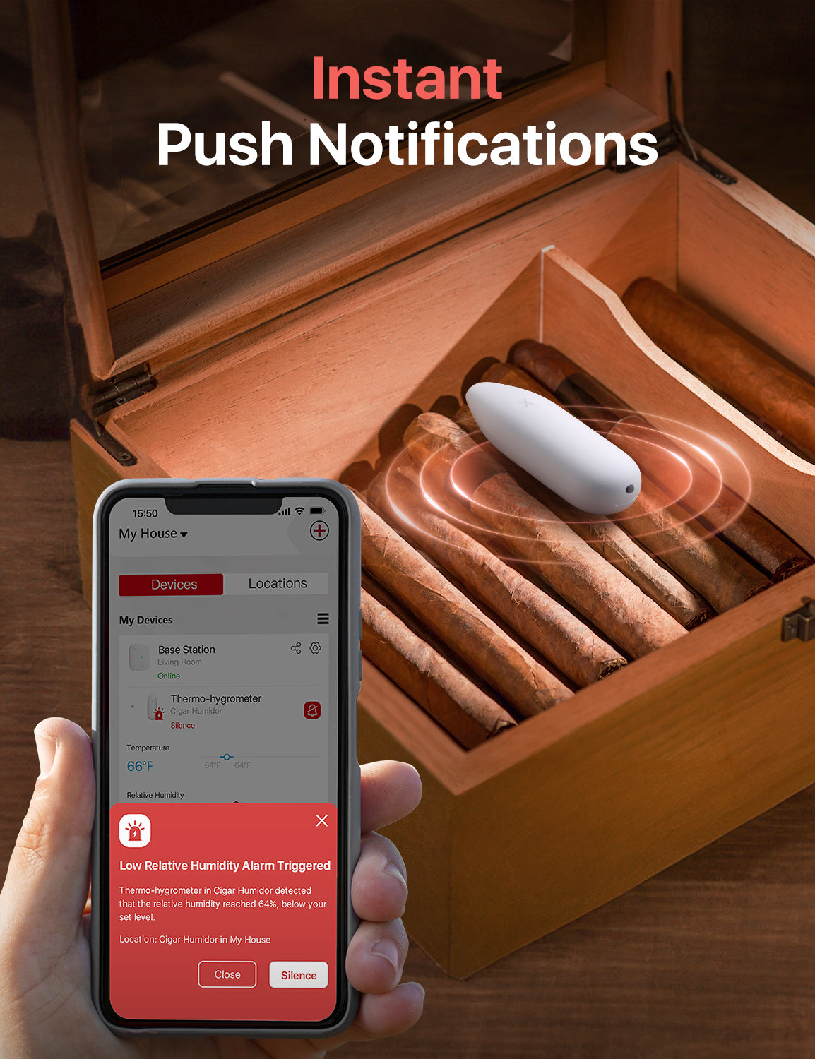 - Precision and Accuracy: Experience unparalleled accuracy with the high-precision Swiss-Made Sensor, ensuring temperature precision to ±0.36°F (±0.2°C) across a wide range of -4-140°F (-20-60°C) and humidity accuracy within ±2% RH (0-100% RH range). Note: Avoid using in metal-encased spaces like refrigerators or freezers to prevent wireless signal interference.
